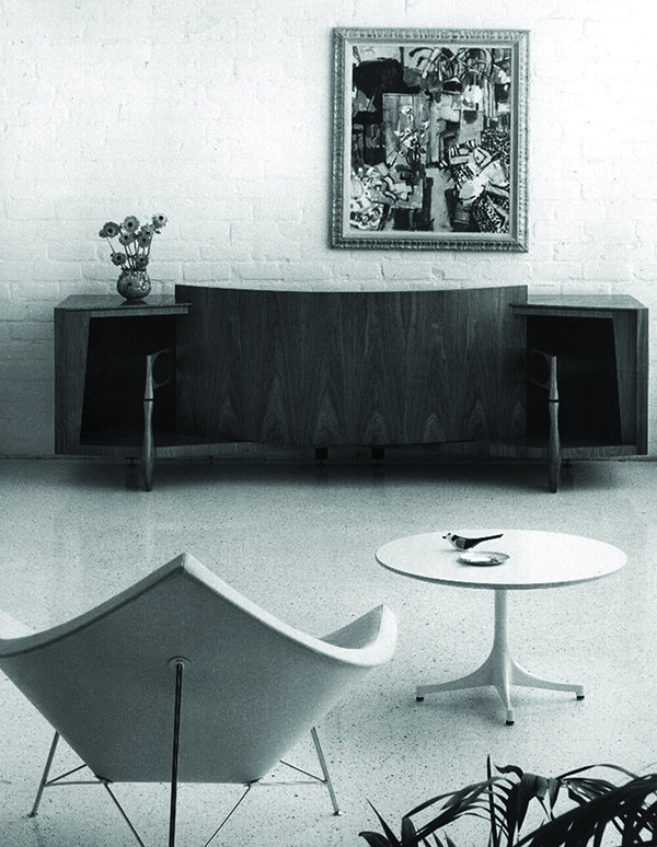 Le Paragon, officiellement baptisé JBL D44000, va naitre. C’est Richard H. Ranger (B), ingénieur et pionnier de la diffusion sonore, venu du cinéma, et appelé en consultant, qui imagine un système où la stéréo serait diffusée à partir d’un meuble unique, à l’aide de surfaces réfléchissantes. Son idée repose sur un panneau incurvé central, capable de réémettre le son provenant de deux canaux latéraux avec une diffusion large et stable. Évidemment, le résultat est techniquement parfait, mais l’objet est énorme et monstrueusement laid.