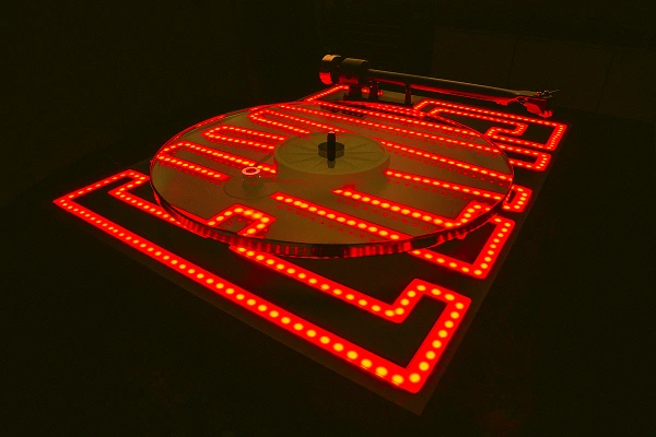 La platine intègre également un éclairage LED rouge sous le contre-plateau afin de créer un effet visuel spectaculaire lorsque la musique démarre. Elle est équipée d’un châssis propriétaire et d’un bras de lecture conçu spécifiquement pour ce modèle.