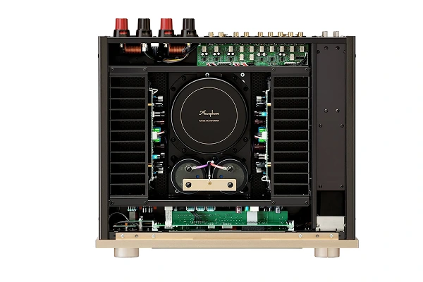 L’amplificateur adopte une configuration particulière, dans le but d’obtenir 35 W sous 8 ohms en toute sérénité, 70 W sous 4 ohms, mais aussi 140 W sous 2 ohms et 160 W pour 1 ohm, tout cela avec une parfaite linéarité. Les deux canaux, qui obéissent à une architecture parfaitement symétrique, emploient deux cartes individuelles qui prennent place sur des dissipateurs thermiques. On retrouve en effet une disposition bien proche de celle du A-80. Les étages de sortie reposent sur les quatre transistors MOS-FET, configurés en quadruple push-pull parallèle.