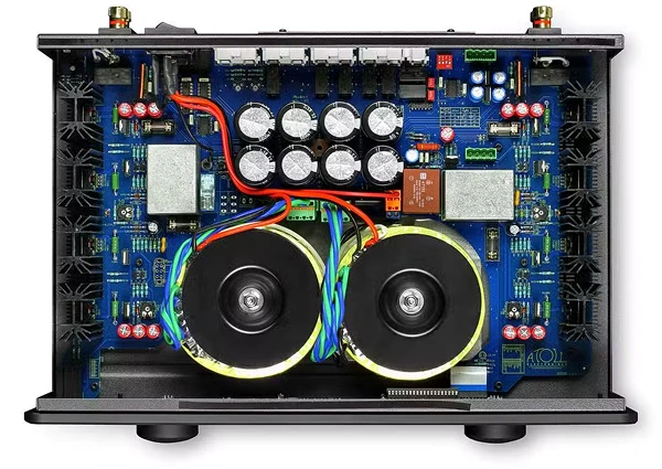 Cet intégré repose sur un schéma entièrement double mono. Il est équipé d’une alimentation soignée à base de deux transformateurs toroïdaux, et d’une alimentation dédiée aux circuits logiques. Les condensateurs ESR de l’alimentation sont réalisés sur cahier des charges et les MKP Mundorf des étages audio sont blindés.