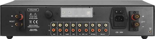 On trouve également une sortie casque jack 6,35 mm. L’IN200 EVO propose quatre entrées analogiques asymétriques dont une pouvant accueillir une carte phono optionnelle, une entrée/sortie Tape, une entrée By-pass et une double paire de sorties Pre-out.