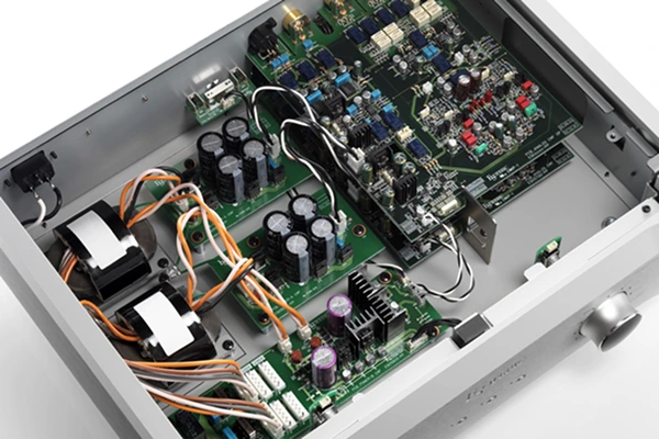 L’E-02 est entièrement symétrique de l’entrée à la sortie. L’étage de gain est intégralement discret, conçu pour traiter les signaux de niveau extrêmement bas provenant d’une cellule MC. Il minimise les interférences de bruit et amplifie puissamment les signaux à faible impédance, afin d’en tirer la quintessence. L’amplificateur RIAA est de type NF-CR, utilisant une boucle de contre-réaction dans la correction, atteignant une précision exceptionnelle de ± 0,2 dB, avec une rétroaction négative minimale. L’étage de sortie du E-02 adopte la même technologie HCLD que le préamplificateur Grandioso C1, où chaque canal est équipé de deux amplificateurs tampons qui pilotent séparément les points chauds et froids en mode XLR. En RCA, les amplificateurs fonctionnent en parallèle pour maximiser la linéarité. Cette conception permet d’obtenir une sortie en courant ultrarapide sur les prises XLR ES-LINK, en plus des connexions XLR et RCA classiques. La construction dual-mono implique pour chaque canal un transformateur R-Core, une carte de puissance et un circuit amplificateur dédié, luxe rarement vu. Pour se protéger des vibrations par effet microphonique, le châssis en aluminium épais compartimenté est très rigide, où la disposition de chaque partie est bien précise. Les pieds brevetés à pointeau et coupelle achèvent de bloquer les vibrations externes.