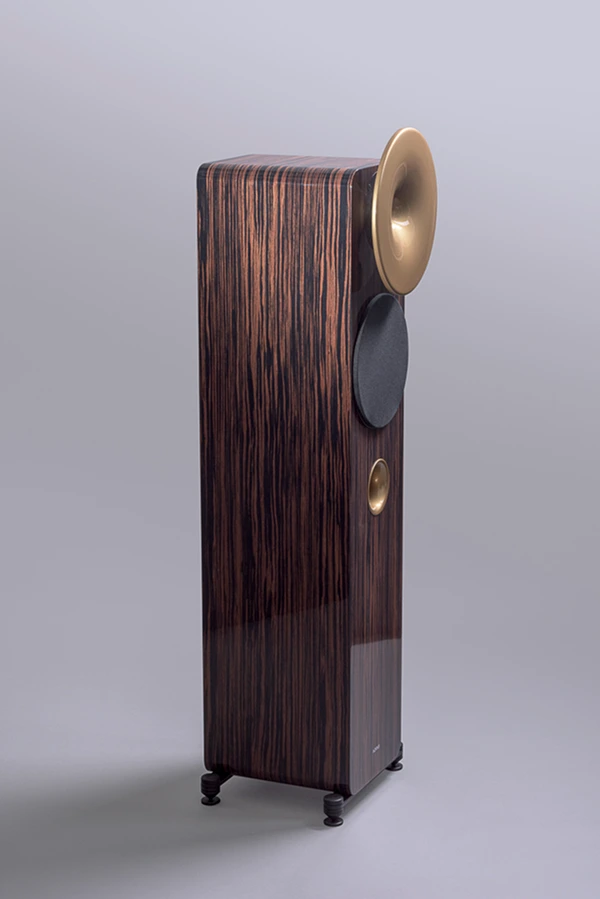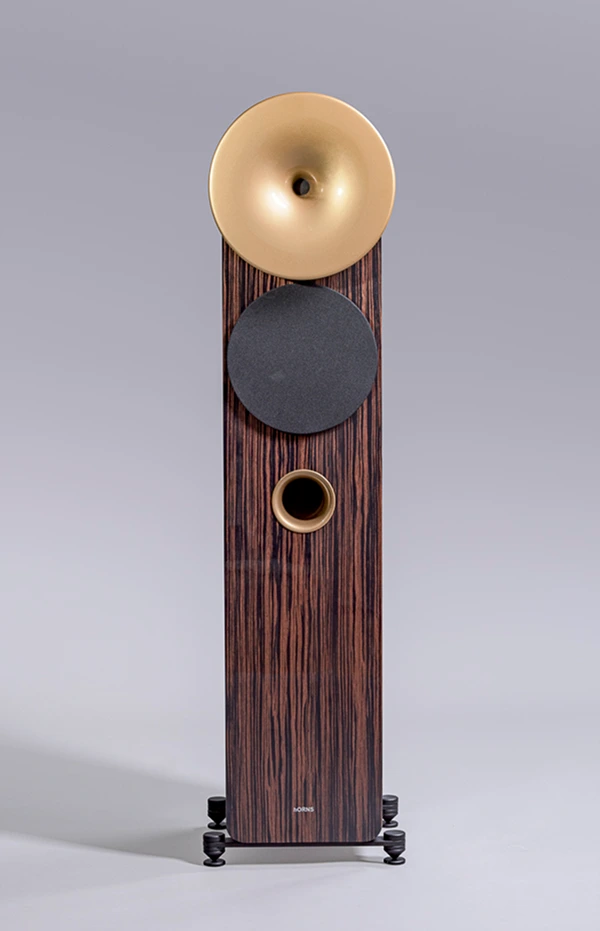 La marque Horns fabrique 15 modèles d’enceintes à pavillon. La gamme Aria comprend trois modèles, coiffée par l’Aria III équipée d’un grave de 20 cm, marié à un pavillon de belle taille. La finition générale de l’enceinte impressionne, ce qui est presque secondaire comparé à la joie de vivre musicale qui s’en dégage. Lukasz Lewandowski n’est pas un novice en la matière, puisqu’il s’est fait connaître pour ses pavillons circulaires Auto-Tech, disponibles en DIY et reprenant le profil Hypex développé par Jean-Michel Le Cléac’h, bien connu des amateurs et malheureusement disparu. Comme le précisait JMLC, «un pavillon agit comme un transformateur d’impédance acoustique. Ceci signifie qu’entre la gorge et la bouche du pavillon, le rapport des pressions est inversement proportionnel au rapport des surfaces». Couplé à une chambre de compression, cela engendre des niveaux acoustiques élevés, d’un rendement dépassant les 30%, à comparer aux 0,3 à 3% d’une enceinte classique. De plus, la pression acoustique élevée régnant au niveau de la membrane atteint des hauts niveaux sonores avec très peu de débattement, ce qui réduit nettement la distorsion. Mais pour être valable, la mise au point doit être irréprochable et sans économies mal placées.