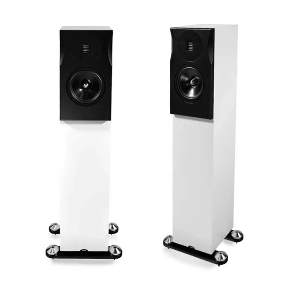 Il dispose d’une pièce de phase en aluminium et s’intègre dans un coffret à deux voies à part entière dont l’évent débouche à l’arrière, séparé de la partie inférieure traitant les très basses fréquences. Il est fixé ainsi que le tweeter sur la face avant épaisse qui apporte une touche d’originalité grâce aux angles biseautés, les découplant efficacement de la caisse.