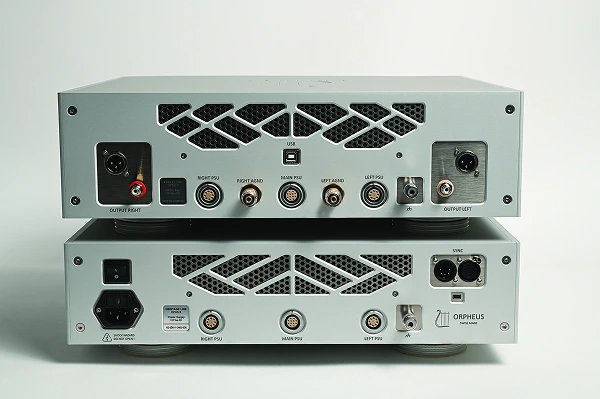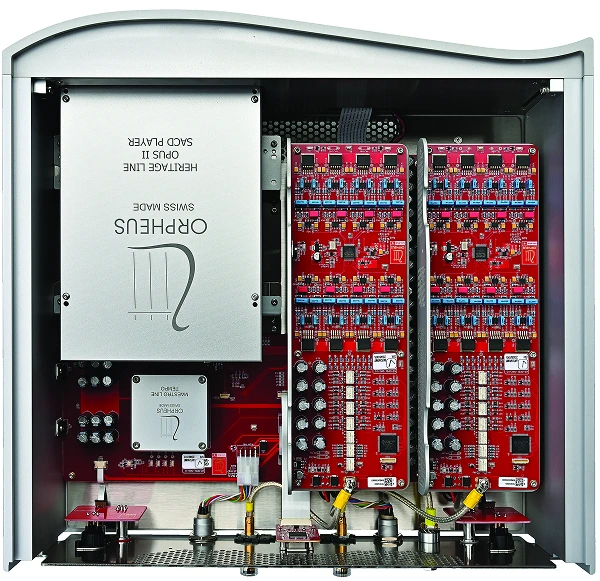 L’architecture du DAC Orpheus est innovante, basée sur une topologie 8-4-4-1. Elle implique 8 convertisseurs synchrones par canal fonctionnant en courant, groupés par paires lors de la conversion courant-tension pour produire 4 groupes. Ceux-ci passent par quatre filtres Revival « de revitalisation » en parallèle, en accordant une grande importance à la phase. L’étage final de sommation utilise des résistances à film métallique de haute qualité avec une tolérance de 0,1 %. Enfin, le niveau de sortie s’ajuste sur une plage de -16 dB à 0 dB, par pas de 0,1 dB, avec la possibilité de symétriser les sorties. Ce réglage baptisé CRQL est identique à celui du préamplificateur Heritage H Two 33BD Opus II.