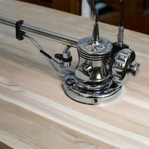 Destiné à l’Intemporelle et à la Classique II, ce bras unipivot de longueur effective 308,6 mm (12 pouces) est lui aussi lourd, d’une masse mobile de 1 150 g, fidèle à la philosophie maison, ce qui surprend pour un bras. Son palier est ingénieux : le tube de base en inox reçoit une pointe fixe en acier carbure, faisant office d’axe. Le bâti supérieur est solidaire d’une rotule qui intègre un point de contact en saphir, réduisant drastiquement la friction. Le léger espace entre les deux parties du pivot peut être amorti par un bain de gel silicone. Le bâti massif soutient le tube du bras composé de deux cylindres enchâssés, celui extérieur en titane, l’autre intérieur en inox, neutralisant les résonances. Le câble Nordost Norse 2, composé de 4 brins 32 AWG en cuivre pur OFC 7N cryogénisé, est placé dans l’axe du centre de gravité, relié à une fiche Lemo 4 points. L’Opus reçoit ici une cellule MC Van den Hul Colibri Grand Cru de couleur rouge, exclusive à Riffaud, dont la compliance est adaptée au bras.