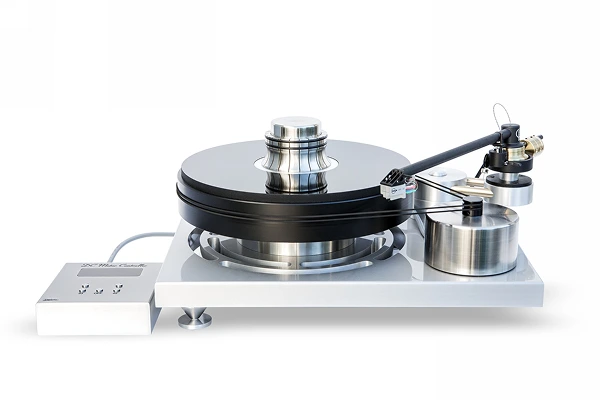 Entraîné par deux courroies en silicone, le plateau de 4 kg de l’Initial est en Delrin, ou POM, un polymère de la famille des polyacétals, d’une résistance élevée à la traction et offrant de bonnes caractéristiques d’isolation électrique, dont la densité est proche de celle du vinyle. Reposant sur trois pointes coniques découplées par une bille, la base en aluminium massif est ajourée par des lumières circulaires, qui servent à contrer les ondes stationnaires et casser les vibrations. Elle reçoit au centre le palier inversé qui utilise une bille de céramique comme point d’appui, alors que le contre-plateau massif en acier augmente la masse et l’inertie. Le plateau de 4 kg est surmonté dans la version Upgraded d’un disque en verre biseauté de 11 mm, solidaire d’une rondelle en acier inox, pour recevoir le magnifique palet presseur métallique usiné. À droite de la base est installé dans sa cage le puissant moteur DC de type Pabst à fort couple, dont le régulateur électronique avec ajustement fin de la vitesse est séparé, ainsi que son alimentation. Enfin, sur une base métallique circulaire sont fixés deux colonnettes horizontales et un support accueillant le bras unipivot, ce qui facilite son ajustage.