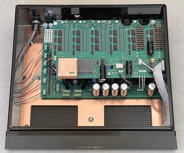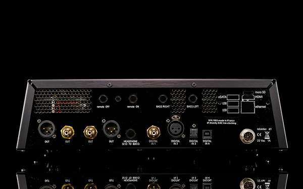 La génération Unity du d1 se caractérise par environ 150 composants, ajoutés ou upgradés sur les cartes électroniques. La conversion se fait toujours selon le principe R2R à échelle de résistances, en utilisant les fameuses Vishay VAR Bulk Foil naked, au nombre de 100, d’une tolérance de 0,01% ! Elles éliminent drastiquement le bruit, car l’élément résistif est «à nu», sans corps extérieur, juste soudé sur les deux pattes et protégé par un isolant, réduisant la distorsion du signal induite par la capacitance/inductance de l’encapsulage. Mais le prix est plus de dix fois plus cher qu’une R standard! Les Totaldac utilisent un FPGA puissant, programmé dans une configuration NOS (Non-Oversampling), et disposent d’un filtre FIR en sortie, débrayable, seulement pour égaliser les fréquences extrême-aigu. La nouveauté vient de la refonte complète de l’étage de sortie, qui fait appel uniquement à des composants discrets en pure classe A. Il délivre un signal de 3,5 V en asymétrique, et 7 V en symétrique, sous basse impédance, ce qui permet de relier le d1-unity à la majorité des préamplis et intégrés, mais aussi directement à un amplificateur de puissance, car le Totaldac contrôle le volume sur toutes ses entrées. Le DAC gère les sources numériques activables depuis la télécommande : USB asynchrone Xmos, RCA et AES-EBU jusqu’à 192 kHz, optique jusqu’à 96 kHz. L’horloge propriétaire intégrée avec mémoire tampon anti-jitter a été optimisée. Une carte streamer interne est disponible en option pour la fonction lecteur réseau compatible Roon, ainsi que le choix optionnel du DSD (format DoP) sur toutes les entrées.