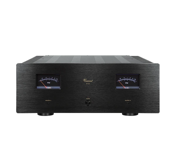 Successeur du fameux SP-331, le SP-332 hybride affiche ses vumètres dont le rétro-éclairage ainsi que les LED d’état s’illuminent selon 4 couleurs : rouge, bleu, vert ou blanc. Le schéma exploite deux tubes 6N16 fonctionnant en push-pull différentiel pour l’étage d’entrée, apportant plus de richesse harmonique. L’étage de sortie comporte 8 transistors pour une puissance de 150 watts sous 8 ohms, 250 watts sous 4 ohms, suffisant pour alimenter la majorité des enceintes. L’alimentation est fournie par un transformateur toroïdal conséquent de 500 W, suivi d’un filtrage capacitif copieux de 80.000 μF, et chose rare d’une stabilisation de la tension par un tube 6N15. Les entrées Ligne sont au choix RCA et XLR, et les 8 borniers acceptent deux paires d’enceintes. Des touches en face avant commutent ou coupent chacune des deux paires (A et B, impédance 4-8 ohms), le bi-câblage étant aussi possible.